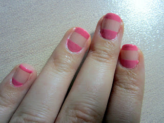 Nada más pintar por encima del celo, lo despego, porque si el esmalte se seca encima del celo, al despegar éste seguramente nos llevemos también alguna parte del color tanto rosa como el base. Por último, cuando se haya secado esta capa, pasamos una capa de esmalte transparente secante. Y voilá!!