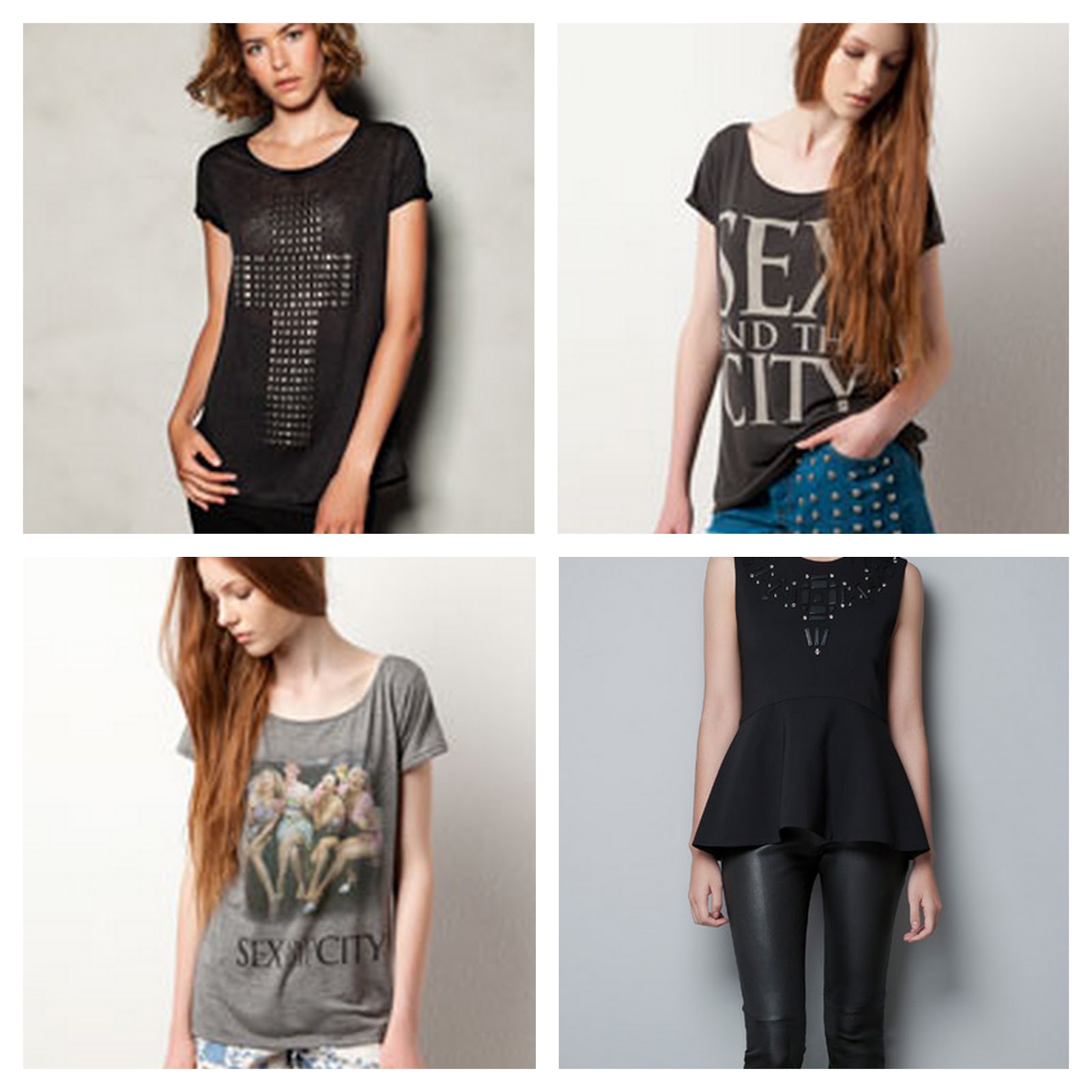 4. Enamorada me hallo de las tres primeras camisetas (Pull and Bear), sobre todo la de la cruz que es tan glam rock!! La última es de Zara, no es que la adore me parece mona, pero otra de las tendencias de este otoño/invierno son esos volantes que añaden tanto a camisetas, vestidos incluso en pantalones.